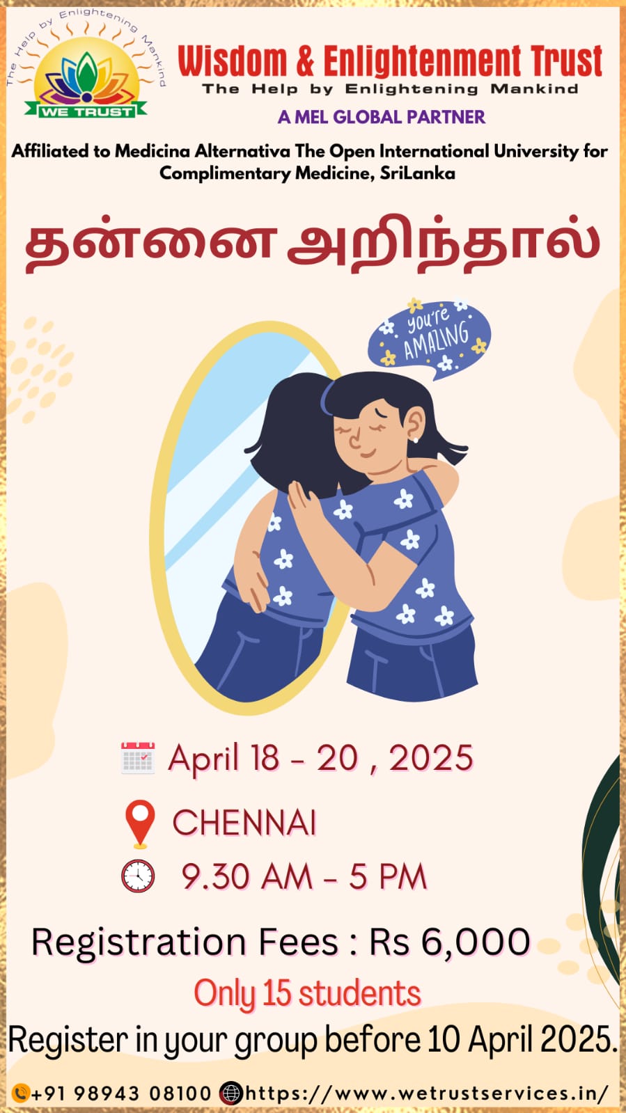 WE Trust : The supporting seminar titled "Thannai Arinthal" is scheduled to take place from April 18 to 20, 2025 at Chennai. For more details, Please contact WE Trust.